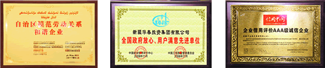 華春投資集團被評為中國優(yōu)秀企業(yè)、全國行業(yè)質(zhì)量服務信譽AAA級單位、“全國政府放心用戶滿意先進單位”、“(首批)全國建設信用誠信企業(yè)”、全國制造行業(yè)質(zhì)量服務信譽AAA級單位、“全國政府放心、用戶滿意先進單位”、全國建設信用誠信企業(yè)、企業(yè)信用評價AAA①級誠信企業(yè)、值得新疆人驕傲的品牌十強企業(yè)等等。