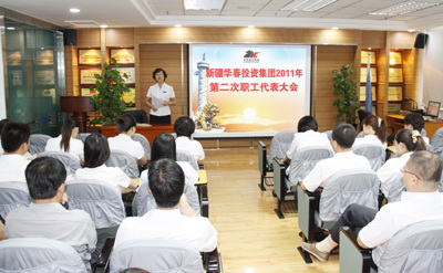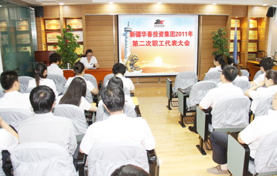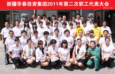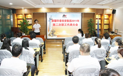 新疆華春投資集團有限公司2011年第二次職工代表大會于7月30日上午在新疆華春投資集團子公司新疆恒潤實業(yè)有限公司培訓室召開,會議由高青同志主持。參加會議的應到職工代表51人,實到職工代表 49人。