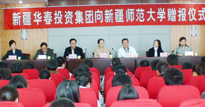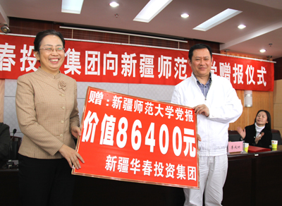 在陽(yáng)春3月的25日下午,新疆華春投資集團(tuán)向新疆師范大學(xué)的贈(zèng)報(bào)儀式在新疆師大教學(xué)主樓學(xué)術(shù)報(bào)告廳隆重舉行。華春投資集團(tuán)首期出資現(xiàn)金將近9萬(wàn)元,訂購(gòu)全年度的黨報(bào)《新疆經(jīng)濟(jì)報(bào)》300份,贈(zèng)送給新疆師范大學(xué)的教師們,方便教師們及時(shí)學(xué)習(xí)了解黨的路線、方針、政策及國(guó)內(nèi)外各項(xiàng)重大信息。新疆華春投資集團(tuán)為推進(jìn)新疆教學(xué)人才的培育、為新疆和諧社會(huì)的構(gòu)建,從而奉獻(xiàn)出新疆華春投資集團(tuán)的一份愛(ài)心。
