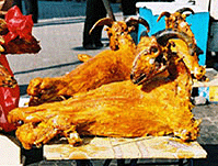 在新疆與北京烤鴨媲美的名貴菜肴就是烤全羊,是維吾爾族的一大傳統(tǒng)名肴。在烏魯木齊、喀什、和田等地的巴扎爾都可聞到它特有的香味。烤全羊不僅是街頭的風味小吃,而且也是維吾爾人招待貴客的上等佳肴,現(xiàn)在也成為高級筵席中的