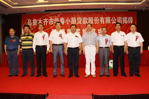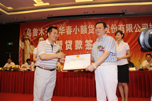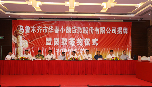 烏魯木齊市華春小額貸款股份有限公司揭牌暨貸款簽約儀式于6月26日在銀都酒店國際會展中心隆重舉行,自治區(qū)黨委常委肖開提·依明與自治區(qū)政協(xié)副主席王偉共同為烏魯木齊市華春小額貸款股份有限公司揭牌,人大、金融界、自治區(qū)工商界直屬商會、企業(yè)家代表等約280人出席了揭牌暨貸款簽約儀式。