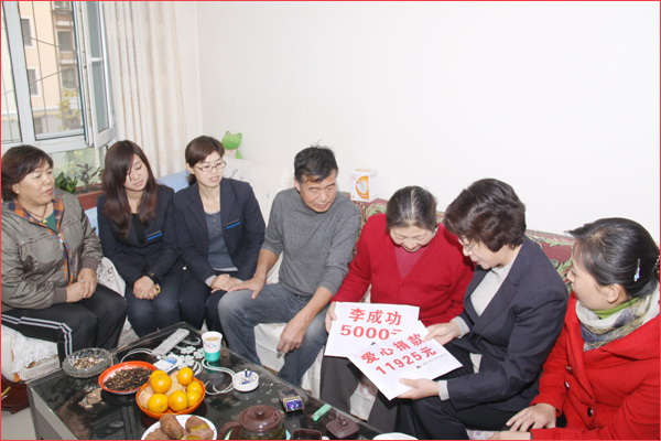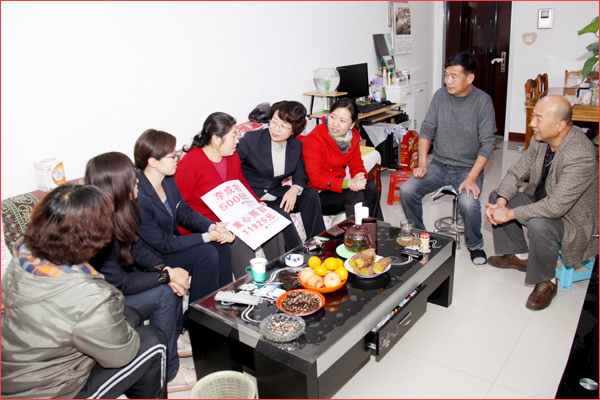 2012年10月17日,盡管季節(jié)已進(jìn)入瑟瑟寒冷的深秋,但新疆華春投資集團(tuán)的愛心捐款,為患病員工送去了溫情暖意。新疆華春投資集團(tuán)工會(huì)主席高青與人力資源部、集團(tuán)子公司華景物業(yè)及編輯部的管理人員一行,代表新疆華春投資集團(tuán)李成功總裁和華春全員前去親切慰問患病的員工杜菊萍,當(dāng)她接過李成功總裁和華春員工16925元的愛心捐款時(shí),流下感動(dòng)的淚水。杜菊萍的丈夫激動(dòng)的一再說:“太感謝華春老總和華春人了,對(duì)一個(gè)基層員工還這樣的關(guān)心,太感謝、太感謝了!”