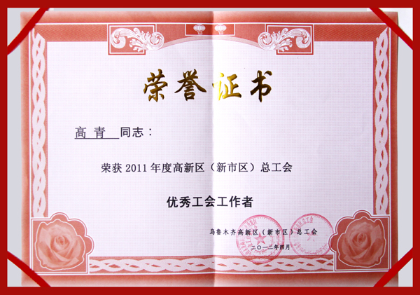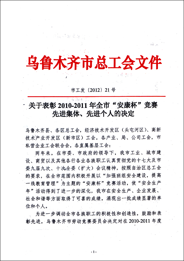 在剛剛結(jié)束的工會工作年度評比中,華春工會與華春工會主席高青被高新區(qū)(新市區(qū))總工會評為“先進(jìn)基層工會一等獎(jiǎng)”、“優(yōu)秀工會工作者”,同時(shí)榮獲由烏魯木齊市總工會、市安全生產(chǎn)監(jiān)督管理局評定的“2010-2011年安康杯競賽先進(jìn)集體”。