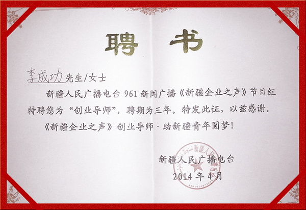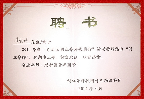 為深入貫徹自治區(qū)黨委、人民政府“實施擴大就業(yè)的發(fā)展戰(zhàn)略,促進以創(chuàng)業(yè)帶動就業(yè)”的總體部署和民生建設年的精神,由自治區(qū)團委聯合自治區(qū)經信委、人社廳、新疆人民廣播電臺、自治區(qū)學生聯合會共同組成的創(chuàng)業(yè)導師校園行活動組委會,特聘新疆華春投資集團李成功總裁為自治區(qū)創(chuàng)業(yè)導師。