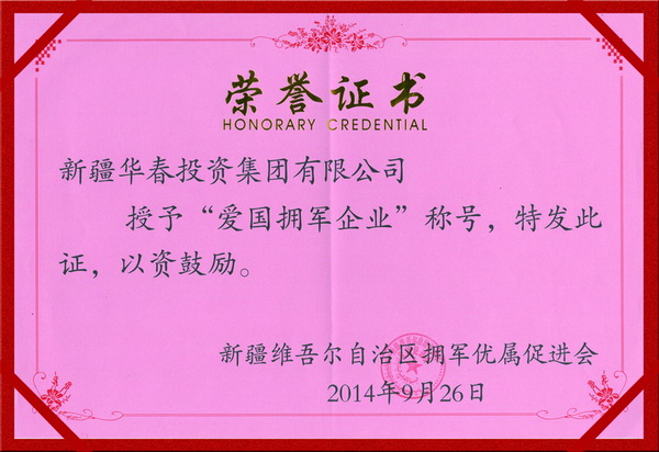 華春集團以科學發(fā)展觀為統(tǒng)領(lǐng),在抓好企業(yè)經(jīng)營的同時,積極維護國家安全和發(fā)展需要,舉辦多種愛國擁軍活動,著力抓好軍民共建,共創(chuàng)新疆安定團結(jié)環(huán)境。體現(xiàn)了新時期、新階段非公企業(yè)和非公經(jīng)濟人士愛國擁軍的精神,為擁軍優(yōu)屬工作和增進軍民團結(jié),做出了重要貢獻,是具有時代特色的愛國擁軍的先進典型。