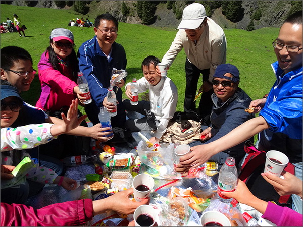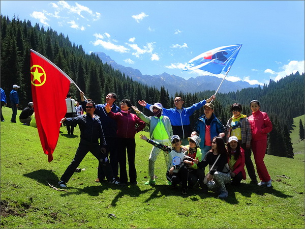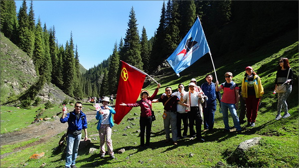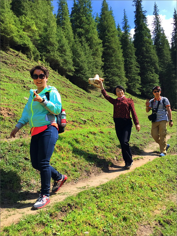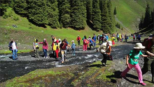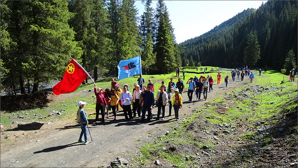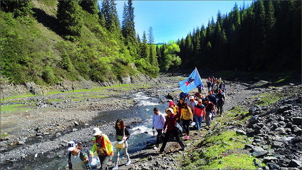 從喧囂的都市來到南山群山中風景優(yōu)美的溝谷之一沙溝,這個位于北天山支脈北麓的山區(qū),集中的展現(xiàn)著大美新疆的妙景。深邃的峽谷,蒼翠欲滴,在重峰疊嶂、唯有山羊才能攀巖上去的危崖聳立之處,一條蜿蜒的山道出其不意在期待著我們的步伐,眼前豁然開闊。在如茵的草坡,山花吐艷。白色的氈房點綴著一派綠色美景,不由得想起一句歌詞:氈房好似珍珠撒。盡管當今已難免的染上了一抹市場經(jīng)濟的色彩,但當哈薩克牧民的羊群從我們徒步隊伍中穿過時,立馬提醒著后人,這個俊美的山區(qū)從唐代就曾是著名的牧區(qū)狩獵區(qū),霎時有一種在時空中穿梭的感覺。