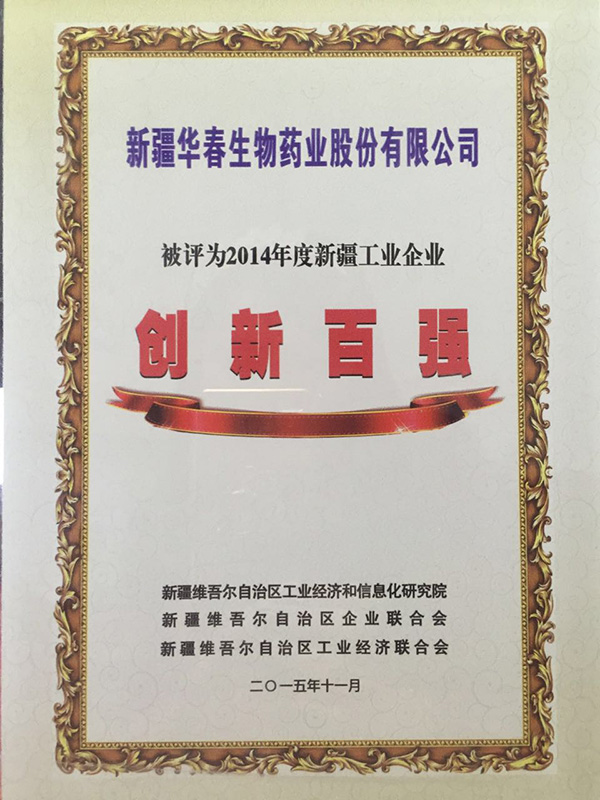 同時在新疆華春藥業(yè)全體同仁近一年的努力下,終于在這8家醫(yī)藥企業(yè)中占有一席,榮獲新疆工業(yè)企業(yè)“創(chuàng)新百強(qiáng)”稱號。進(jìn)一步增加了華春藥業(yè)的品牌價值,為藥業(yè)的宣傳與發(fā)展又增添了濃墨的一筆。
