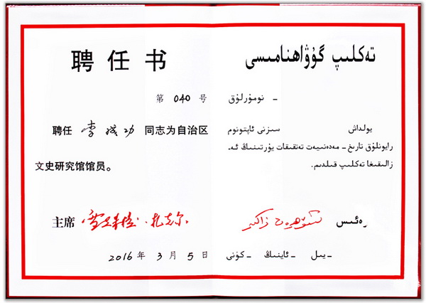 自治區(qū)政府主席向新疆華春投資集團總裁李成功頒發(fā)館員聘書