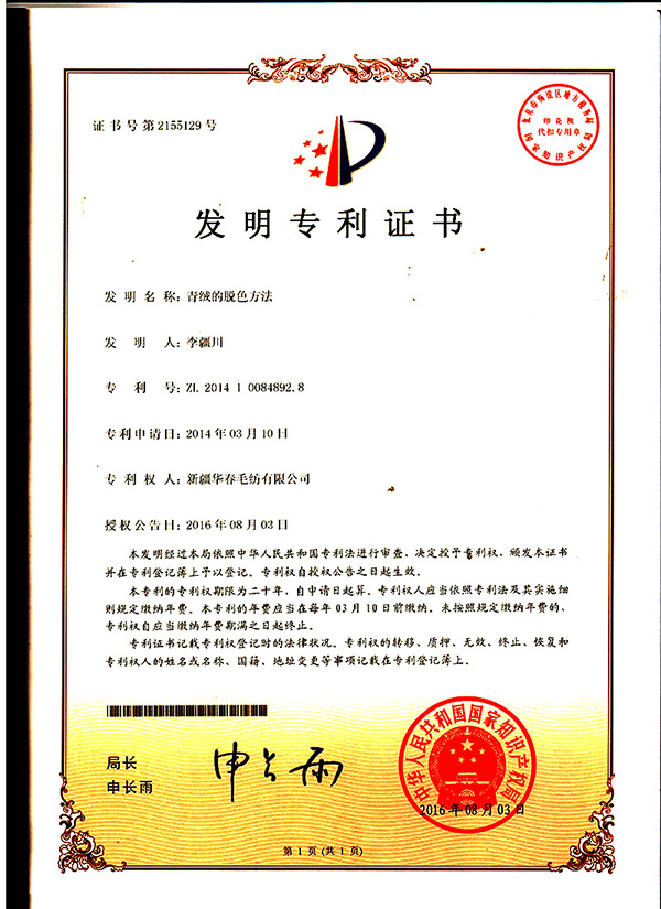 近日,經(jīng)國(guó)家知識(shí)產(chǎn)權(quán)局評(píng)審,新疆華春毛紡有限公司申請(qǐng)的“青絨的脫色方法”技術(shù)創(chuàng)新成果,喜獲國(guó)家發(fā)明專利,專利號(hào)為 ZL 201410084892.8。