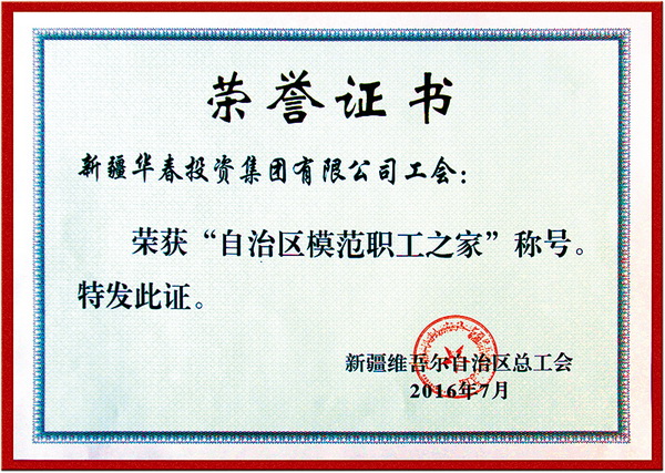 華春集團工會的典型事跡被定為培訓全國工會干部的教材,獲得諸多榮譽,被烏魯木齊市總工會授予“模范職工之家”、被新疆自治區(qū)總工會、人力資源和社會保障廳等授予“自治區(qū)模范勞動關(guān)系和諧企業(yè)”、被全國總工會、全國工商聯(lián)、人力資源社會保障部授予“全國就業(yè)與社會保障先進民營企業(yè)”、被全國總工會、發(fā)展改革委、科技部授予全國“講理想、比貢獻”先進集體等榮譽稱號。