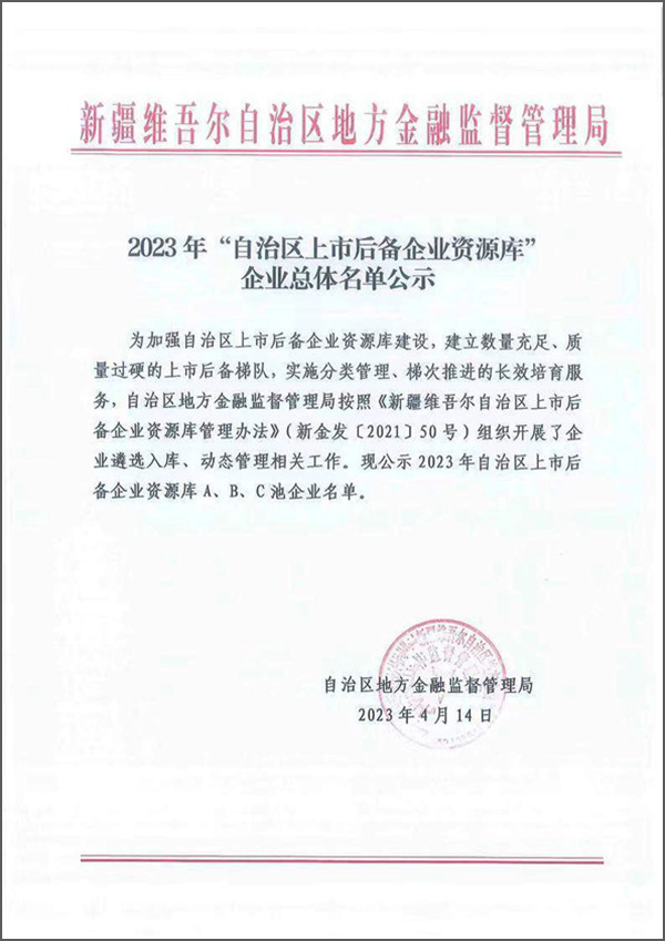 列入“自治區(qū)上市后備企業(yè)資源庫”的企業(yè),是自治區(qū)政府為加強自治區(qū)上市后備企業(yè)資源庫建設(shè)而建立的數(shù)量充足、質(zhì)量過硬的上市后備梯隊。自治區(qū)企業(yè)上市推進工作領(lǐng)導(dǎo)小組辦公室按照《新疆維吾爾自治區(qū)上市后備企業(yè)資源庫管理辦法》進行企業(yè)遴選入庫、動態(tài)管理,對入選的企業(yè)實施分類管理、梯次推進的長效培育服務(wù),旨在深入發(fā)掘擬上市企業(yè)資源,優(yōu)化資源配置,加強多層次資本市場建設(shè),促進自治區(qū)企業(yè)在多層次資本市場上市、掛牌和融資。