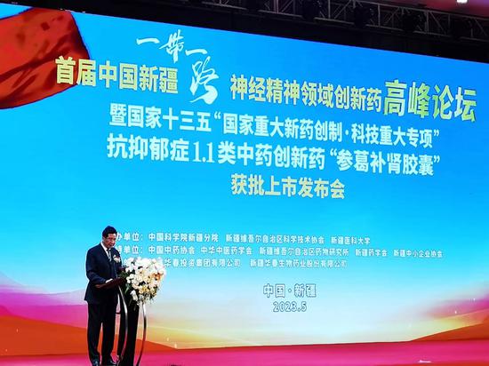 論壇會(huì)上進(jìn)行了重大科技成果發(fā)布,由新疆華春生物藥業(yè)股份有限公司與清華大學(xué)生命科學(xué)學(xué)院聯(lián)合研發(fā)、被定為國(guó)家十三五“國(guó)家重大新藥創(chuàng)制•科技重大專項(xiàng)”抗抑郁癥1.1類中藥創(chuàng)新藥“參葛補(bǔ)腎膠囊”獲批上市,舉辦了隆重的產(chǎn)品上市儀式,這是新疆國(guó)家1.1類創(chuàng)新藥。