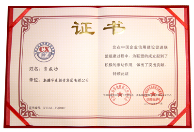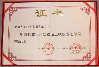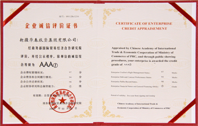 華春投資集團被評為最高信用等級即AAA①級的誠信企業(yè),頒發(fā)了信用等級證書,并出具了信用等級評估報告。同時,華春投資集團被商務部研究院信用評級與認證中心定為中國企業(yè)信用建設促進聯盟發(fā)起單位,總裁李成功先生被定為中國企業(yè)信用建設促進聯盟發(fā)起個人。
