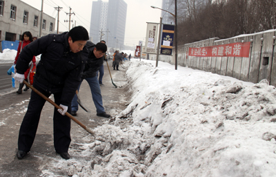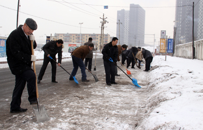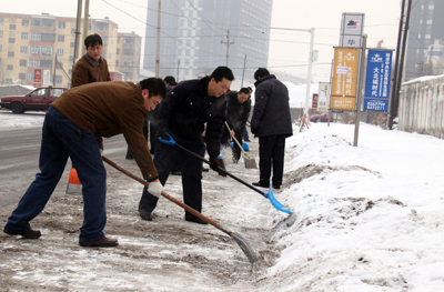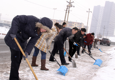 于第二天周六休息日,華春投資集團(tuán)黨委組織全體黨員進(jìn)行了新年的第一次義務(wù)勞動,掃除通往蘇杭明珠小區(qū)四平路上的積雪,為在這里上班的員工和小區(qū)居民提供了出行的方便。