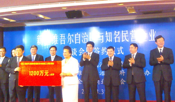 會上,全國工商聯(lián)代表團(tuán)向自治區(qū)工商聯(lián)捐贈了1200萬元,以用于新疆的社會公益事業(yè)。