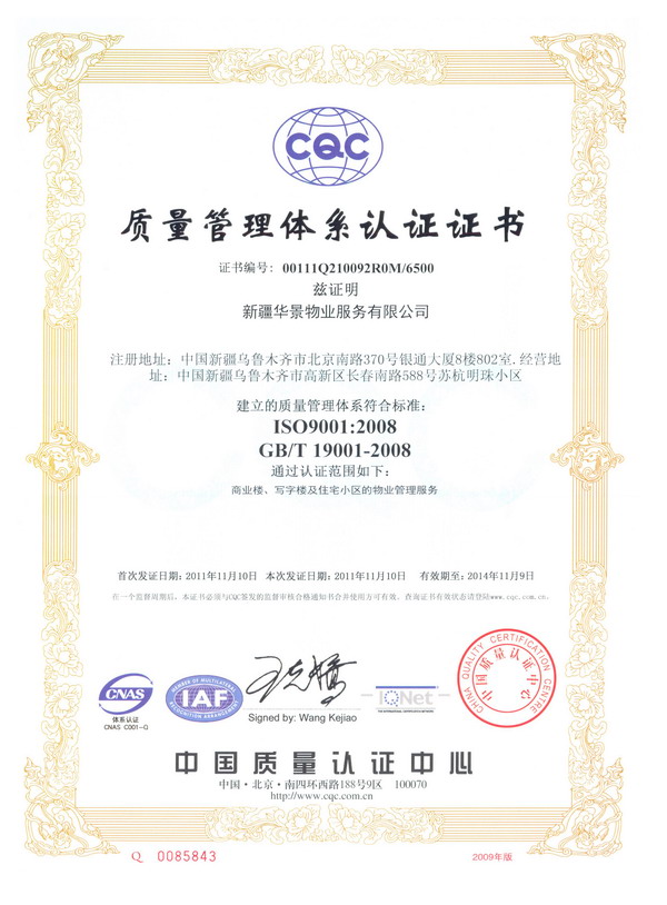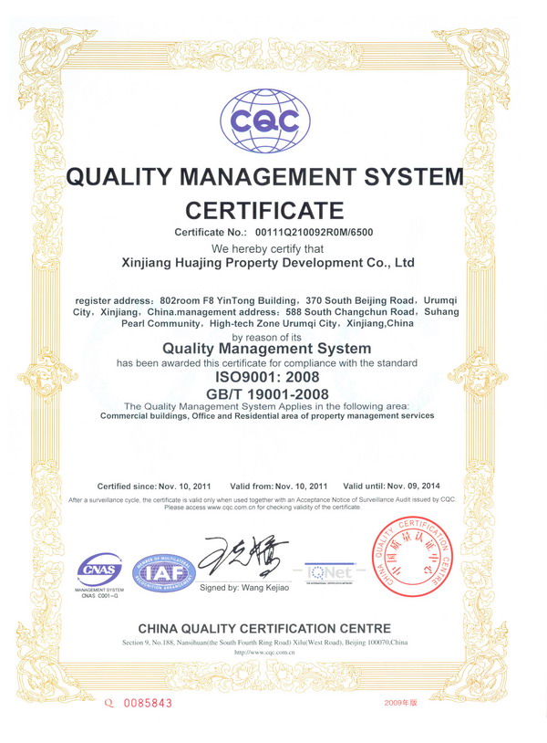 為了能夠長期、穩(wěn)定地向業(yè)主提供滿意的服務和品質,華景物業(yè)始終堅持以創(chuàng)新科技求發(fā)展,以高質量求生存,推行先進的管理理念,建立最新的管理質量體系作為企業(yè)宗旨,使公司能夠早日與國際質量體系接軌。2011年在公司領導的大力倡導下,在各職能部室的全力配合下,由中國檢驗認證集團新疆有限公司委派的審核組成員一行五人,依據(jù)GB/T19001-2008標準、相關法律法規(guī)的要求,對華景物業(yè)公司認證范圍內所涉及的商業(yè)樓、寫字樓和住宅小區(qū)的物業(yè)管理服務過程進行了現(xiàn)場審核,經過為期兩天的現(xiàn)場審核,審核組成員對華景物業(yè)ISO9000管理體系建立的有效性和符合性給予了肯定,并與2011年11月10日正式取得了由中國質量認證中心頒發(fā)的質量管理體系認證證書。