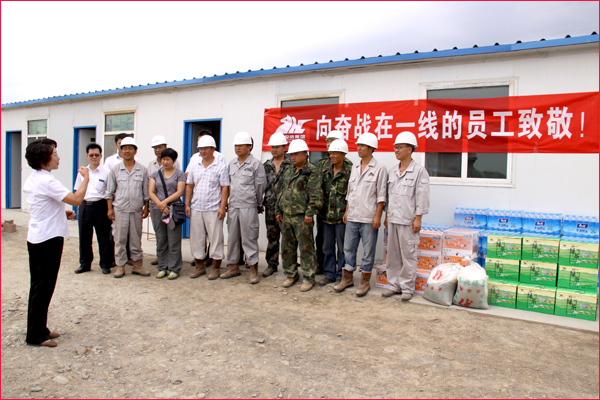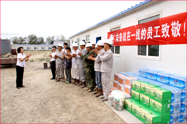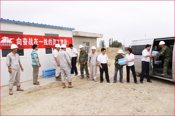 6月30日,新疆華春投資集團(tuán)工會(huì)主席高青和行政辦副主任鄭培君、華春集團(tuán)子公司新疆恒潤(rùn)實(shí)業(yè)有限公司辦公室主任及集團(tuán)編輯部全員一行,將一箱箱的統(tǒng)一綠茶和茉莉蜜茶、一件件的純凈水及綠豆、冰糖、白糖等降溫防暑飲料與物品,送給奮戰(zhàn)在五家渠華春毛紡工業(yè)園項(xiàng)目建設(shè)工地的一線員工,同時(shí)也送去了李成功總裁和華春全員的關(guān)愛之心。一線員工們接到公司送來的慰問品,深深感受到公司的關(guān)懷,“感謝李總裁對(duì)我們的關(guān)心!謝謝公司對(duì)我們的慰問看望!”