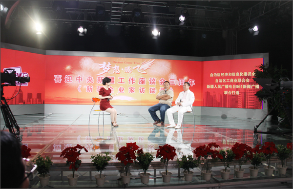 在中央新疆工作座談會三周年到來之際的5月17日,新疆華春投資集團李成功總裁做客由新疆人民廣播電臺新聞廣播聯(lián)合自治區(qū)經(jīng)信委、自治區(qū)工商業(yè)聯(lián)合會舉行的“夢想騰飛·喜迎中央新疆工作座談會三周年新疆企業(yè)家訪談錄” 直播現(xiàn)場,為80位企業(yè)家代表解讀了企業(yè)在新疆發(fā)展中面臨的機遇和前景、夢想。