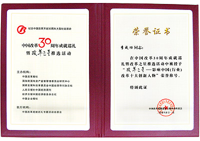 旨在關(guān)注改革進(jìn)程、展示改革成就、聚焦改革之星、弘揚改革業(yè)績,由中國改革報社、國務(wù)院國有資產(chǎn)監(jiān)督管理委員會研究中心、國家發(fā)展和改革委員會中國經(jīng)貿(mào)導(dǎo)刊雜志社、人民日報社中國經(jīng)濟(jì)周刊、經(jīng)濟(jì)日報中國經(jīng)濟(jì)信息雜志社及中國企業(yè)報社六家機(jī)構(gòu)特聯(lián)合主辦的中國改革開放30周年成就巡禮暨改革之星頒獎典禮,于11月6日下午在莊嚴(yán)的北京人民大會堂隆重舉行。新疆華春投資集團(tuán)董事局主席兼總裁李成功先生榮獲“改革之星——影響中國(行業(yè))改革十大創(chuàng)新人物”獎項。